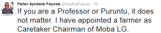 Ekiti state governor Ayo Fayose announced this on twitter.