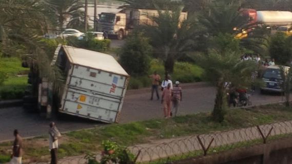 Trailer With Container Nearly Falls Off A Bridge In Lagos (Photo)